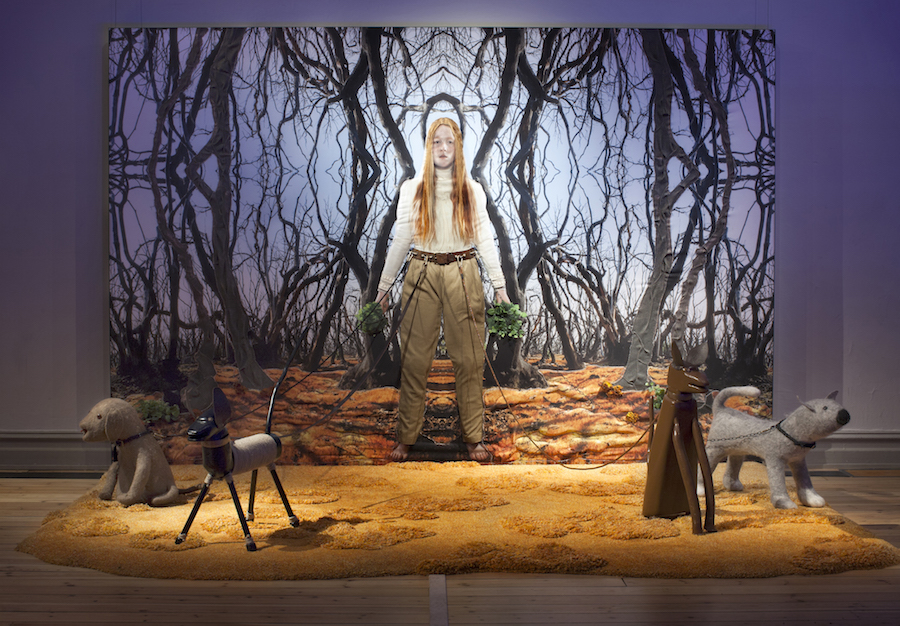 I verket Sök blickar vi in i en svartbränd skog. Vi betraktar landskapet, men där finns också en ung kvinna som i sin tur betraktar oss. Kanske når hon oss i högre grad än vi når henne, för vi känner doften av hennes buketter av citronmeliss och det är hennes hundar som upptar platsen i mossan som vi vill gå på. Välkommen att ta del av hennes värld, med alla sinnen.